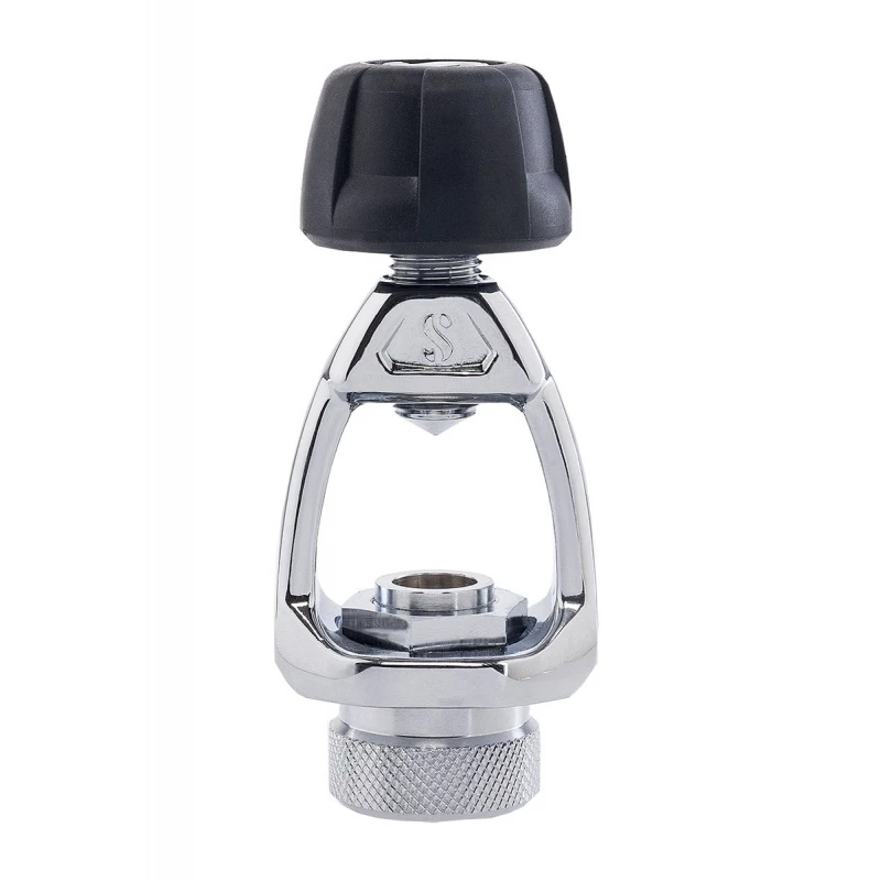 L’étrier ne dispose pas d’un cache en plastique et son placage nickel et chromé est de la plus haute qualité, semblable à ce qu’on peut trouver sur les détendeurs de la gamme EVO de SCUBAPRO.