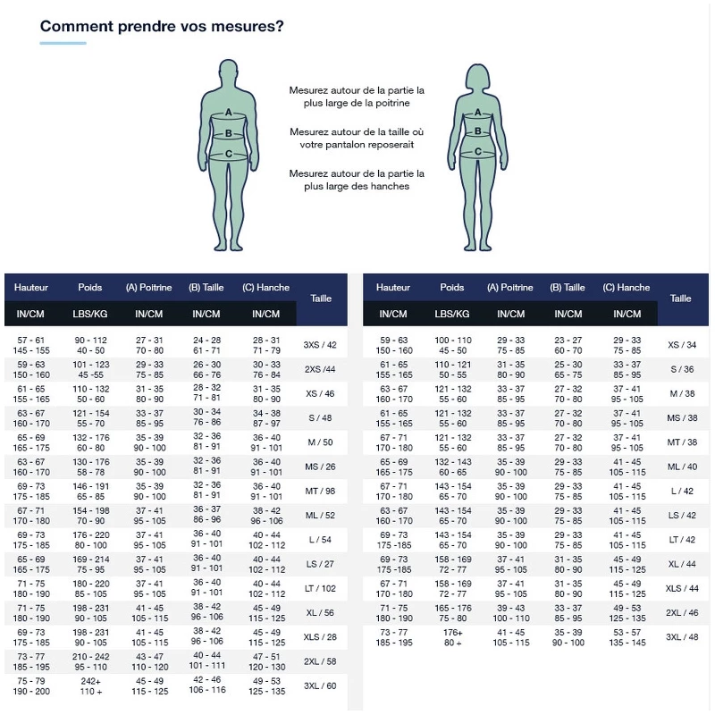 | Modèles | Lady – XS, Lady – S, Lady – M, Lady – ML, Lady – L, Lady – XL, Lady – XXL, Man – XS, Man – S, Man – M, Man – ML, Man – XL, Man – XLS, Man – L, Man – XXL |