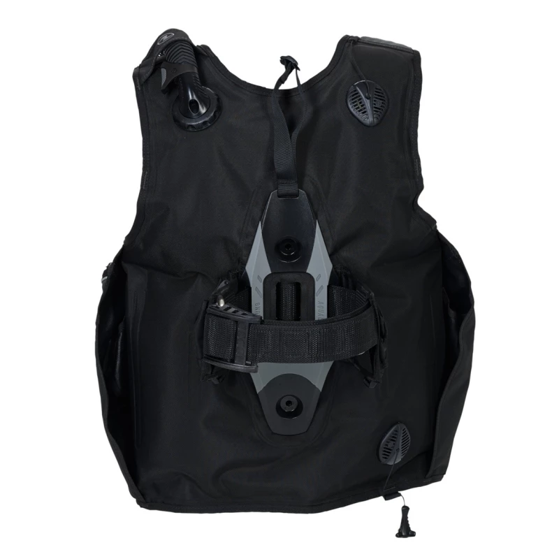 • Modulable. Certains plongeurs peuvent choisir de faire passer leurs instruments derrière la poche gauche et les faire ressortir par l’ouverture du gilet prévue à cet effet en haut, devant le lobe.