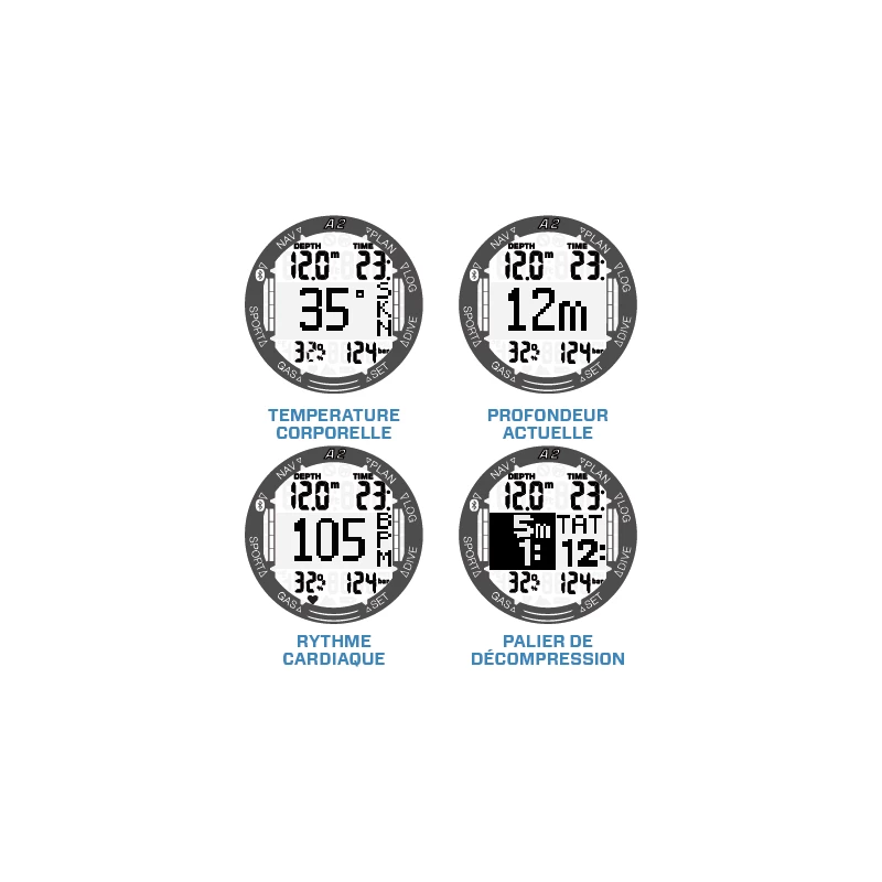 - Pour l’utilisation quotidienne en surface, le A2 offre toutes les fonctions qu’on peut attendre d’une montre ainsi qu’un mode Sport.