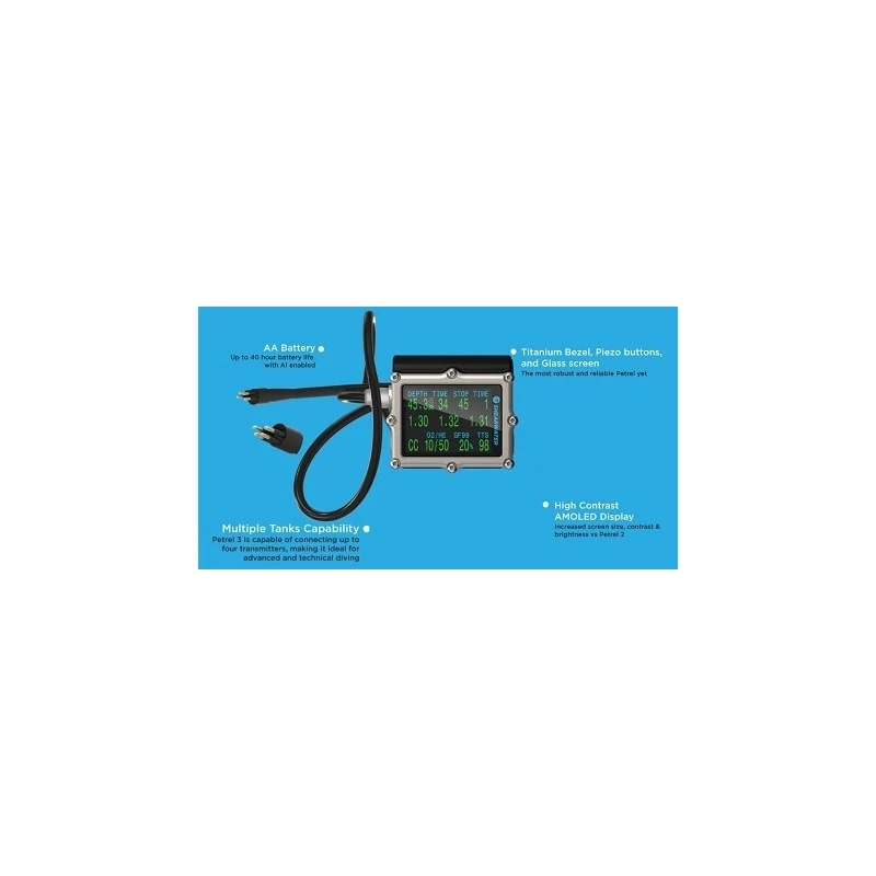 Le SHEARWATER PETREL 3 offre aux plongeurs l’expérience la plus connectée. Un superbe écran AMOLED de 2,6 pouces facile à lire est protégé par une lentille en verre trempé, une lunette en titane et des boutons tactiles piézo.